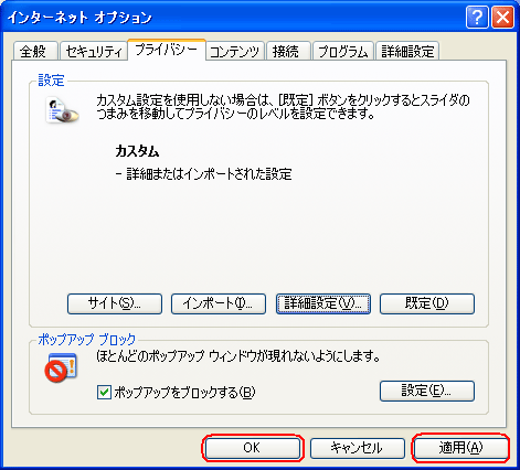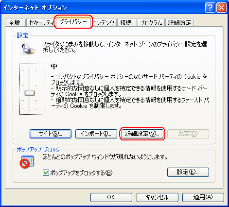 1.キャッシュをクリアします。(省略可) ブラウザのメニューから【ツール】→【インターネットオプション】を選択、次に[インターネット一時ファイル]の[ファイルの削除]ボタンを押します。これでキャッシュがクリアされます。 2.プライバシーの設定 ブラウザのメニューから【ツール】→【インターネットオプション】を選択、次に【プライバシー】タブをクリックして、設定の [詳細設定] ボタンを押します。 |