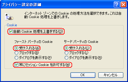 3.クッキーの設定 設定画面が表示されますので [自動 Cookie処理を上書きする]という項目をチェック、ファーストパーティー、サードパーティーを共に[受け入れる]を選択します。[常にセッションCookieを許可する]もチェックします。OKボタンを押します。 |